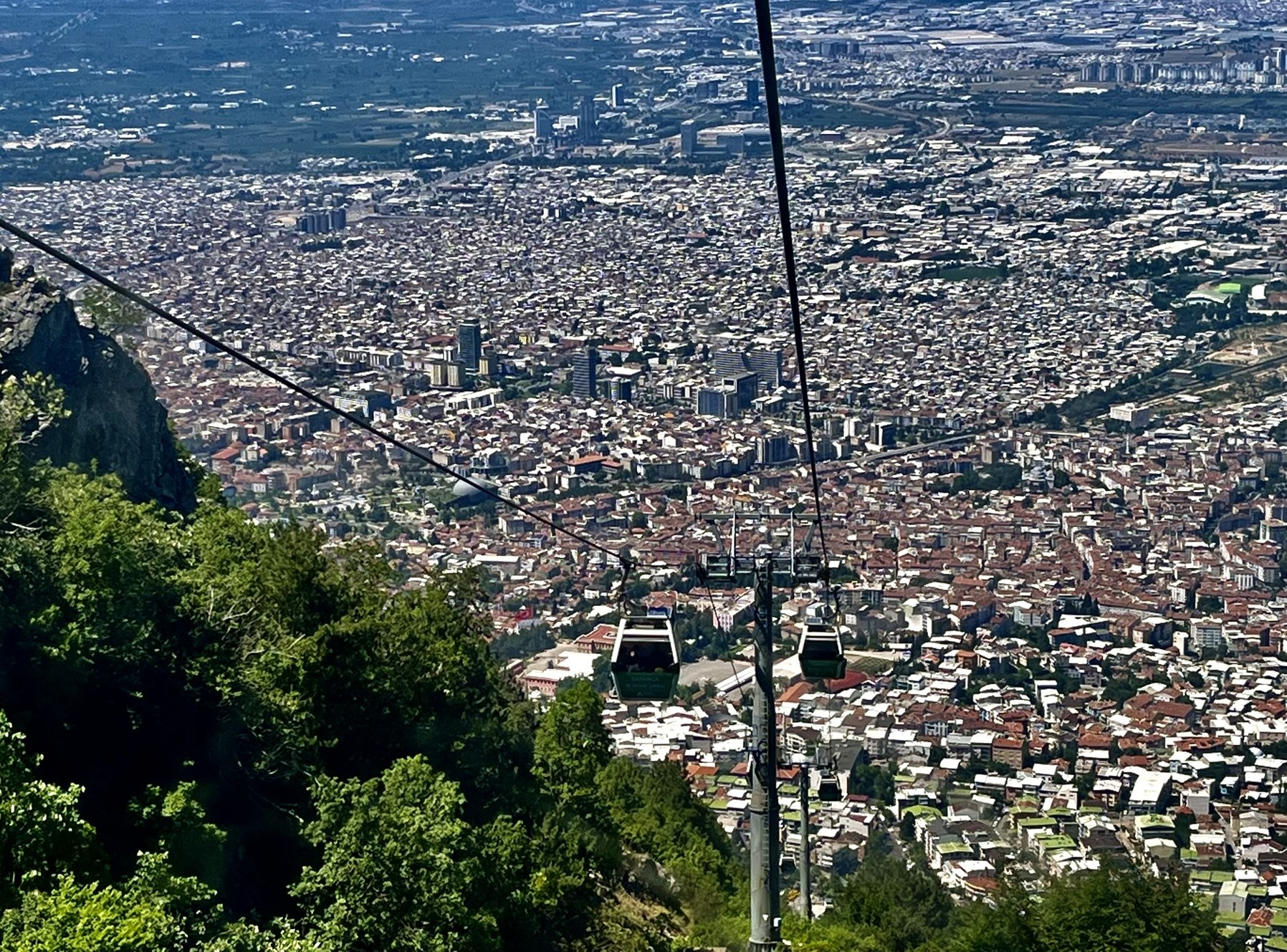 Yemekten sonra Bursa’nın simgelerinden, Uludağ Milli Parkında yer alan Teleferiğe binmek için ana durak Teferrüç’e geldik. Modern bir bina ve ferah bir otopark. Bilet aldıktan sonra harika manzaralar eşliğinde 30 dakika sürecek yolculuk başladı.174 kabinden oluşan bu güzergâhta isterseniz özel kabine binebiliyorsunuz. Dağın zirvesine ulaşmak için havada süzülen teleferik kabininin camlarından şuraya bak buraya bak derken vaktin nasıl geçtiğini anlamadık. Sırasıyla Kadıyayla, Sarı alan ve en son oteller bölgesi Kurbağa Kaya istasyonlarında durduk. Her molada inerek çevreyi gezdik. Türkiye’nin en büyük kayak merkezi Uludağ’a yapılan teleferik hattının inşaatı 1958’te başlamış, Cumhuriyet’in 40.yıl kutlamalarının yapıldığı 29 Ekim 1963’te açılmış. Teleferik aynı zamanda halatlı taşımacılık alanında 9 km uzunluğu ile Türkiye’nin en uzun teleferik hattı. Kışın bembeyaz bir örtüyle kaplanan bu güzellik Bursa’nın en fazla ziyaret alan yerlerinden biri.