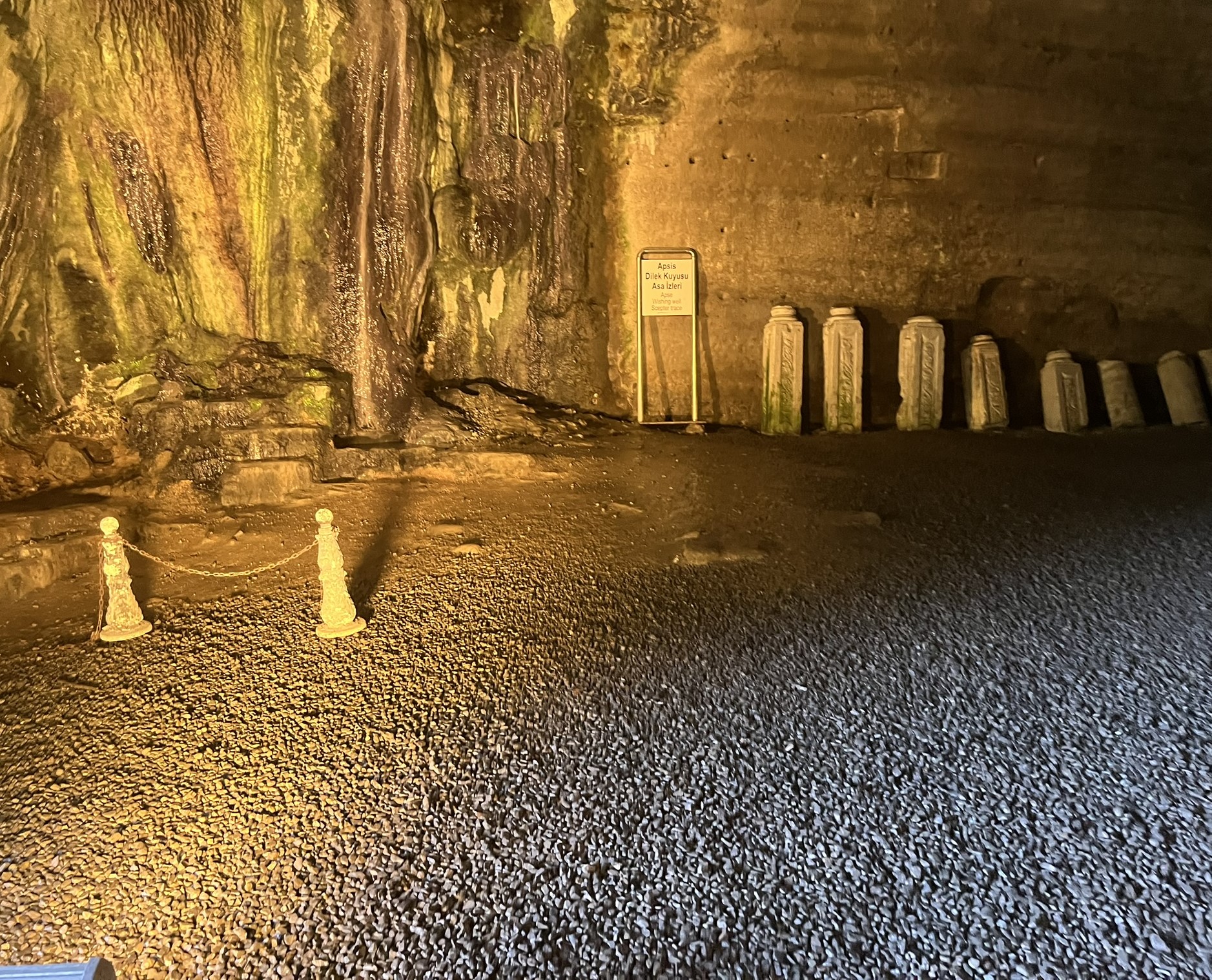 Ulu ağaçlar, şırılşırıl akan sular, yemyeşil vadi, arkeolojik kaynaklarda “kehanet mağaraları” diye adlandırılan gizemli mağaralar…Girişte ağaçtan yapılan, ince ince oyulmuş malzemeler satılıyor. Burada bir yazı çok hoşuma gitti. “Atılacak ve Yakılacak Ağaç yoktur.”