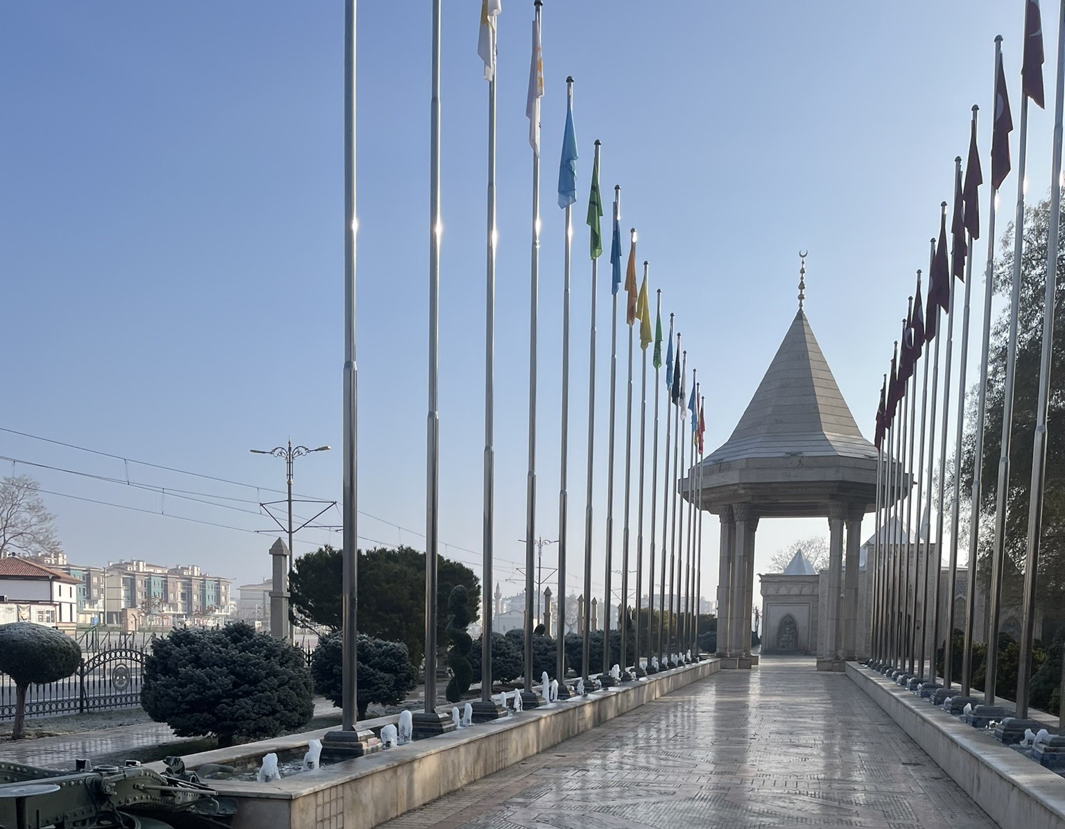 İstiklal Harbi Şehitleri Abidesi’ne doğru yürüyoruz. Meydana yaklaştıkça anıtın heybeti daha da belirginleşiyor. 2008 yılında Selçuklu mimarisi tarzında tasarlanan bu görkemli yapı, kadim 16 Türk devletinin bayraklarının sıralandığı havuzlu yol ile ziyaretçilerini karşılıyor. Su sesinin dinginliği ile bayrakların vakur duruşu yan yana… I. Dünya Savaşı, İstiklal Harbi, Kore Savaşı ve Kıbrıs Barış Harekatı’nda şehit düşenlerin anısına yapılmış bu abide, yalnızca bir anıt değil; bir hafıza mekânı. Taşın diliyle yazılmış bir minnet duygusu gibi yükseliyor gökyüzüne.