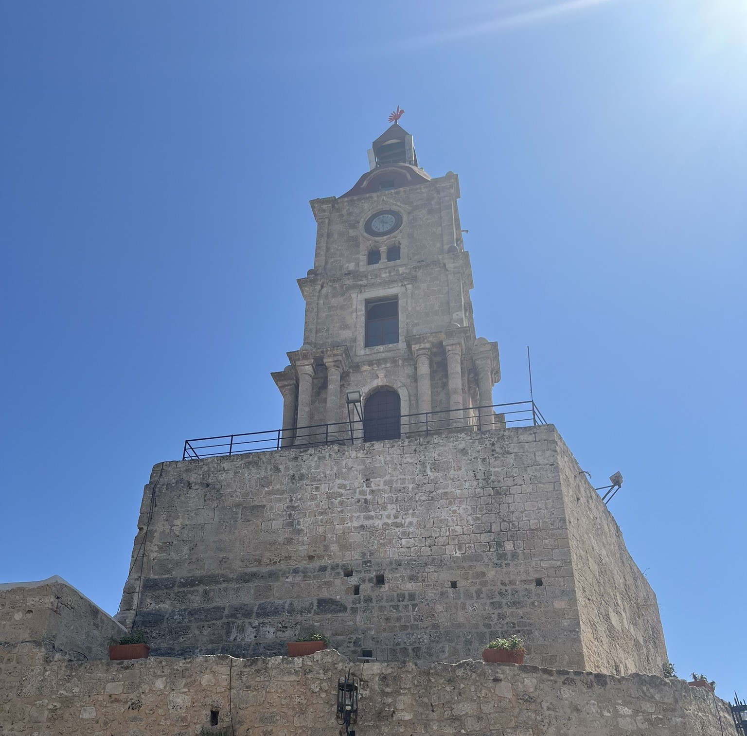 Eski kentin en yüksek noktası olan Orta Çağ Saat Kulesi’nin (Roloi) dibinde soluklanıyoruz. Kule, 1852 yılında Sultan Abdülmecid döneminde, Tophane müşiri Ahmed Fethi Paşa tarafından yaptırılmış. Günümüzde seyir kulesi olarak kullanılıyor. Biraz yokuş tırmanarak kuleye giriyorum. Giriş bileti, aşağıdaki terasta bir şeyler içmek koşuluyla veriliyor. Oturup içmediğim hâlde, görevli çıkarken elime bir şişe soğuk su tutuşturuyor. Uzun bir merdiveni tırmanıp balkonu çepeçevre dolaştığımda karşıma çıkan manzara büyüleyici. Adayı ele geçiren farklı kültürlerin bıraktığı izlerle harmanlanmış bu görüntüyü uzun uzun seyrediyorum.