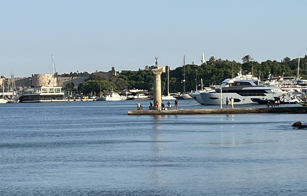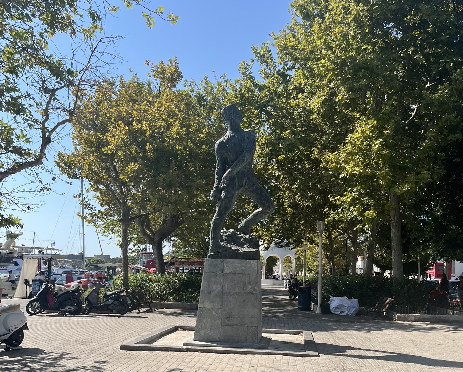 Mandraki Limanı’na doğru ilerlerken, mitolojide güzellik ve aşk tanrıçası olarak bilinen Afrodit’e adanmış tapınağın kalıntılarının arasından geçiyoruz. Tarihi MÖ 3. yüzyıla uzanan bu alan, Rodos Belediyesi Sanat Galerisi’nin hemen karşısında yer alıyor. Meydana yaklaştığımızda, ulu ağaçların gölgesindeki Silmar Kafe’ye oturmayı düşünüyoruz; ancak lezzetler hayal kırıklığı yaratıyor. Biraz ileride, Yunanistan’ın eski cumhurbaşkanlarından Konstantin Karamanlis’in (1907–1998) heykeliyle karşılaşıyoruz.