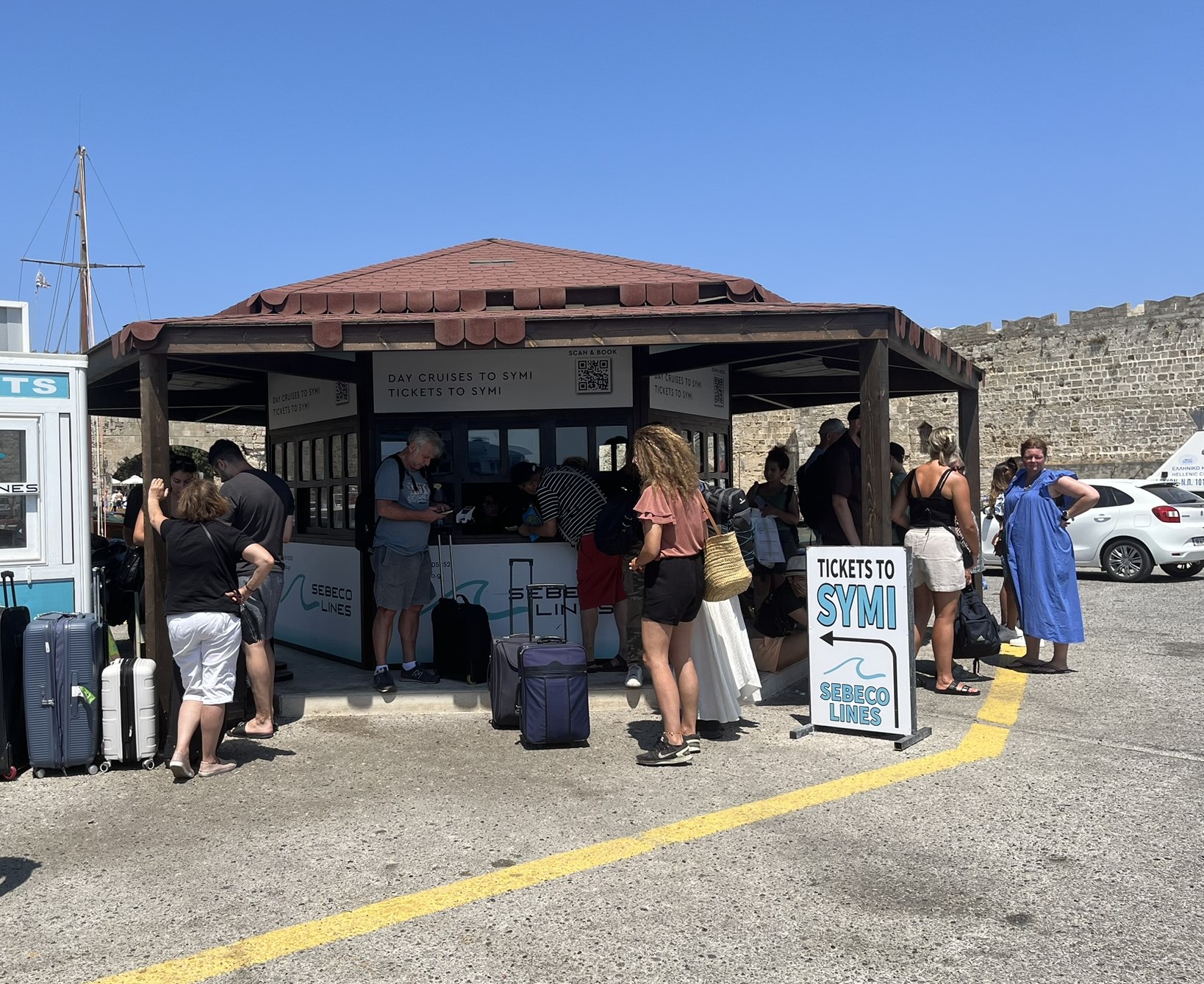 Mandraki Limanı’nda, ağaçlar ve çiçekler arasında İtalyanlar tarafından yapılmış zarif bir beton çardak var. Fazla gölge yapmasa da bulunduğu yere ayrı bir estetik katıyor. Yunanistan Bankası binasını geçtikten sonra tekne biletleri satan küçük büfelere ulaşıyoruz. Bunlardan yalnızca biri Simi bileti satıyor: Sebeco adlı taşımacılık firması. Pasaportlarımızı gösterip kalacağımız oteli bildiriyoruz. Gidiş-dönüş biletlerimizi aldıktan sonra, ertesi gün bizi buradan hareket eden bir servisle limana götüreceklerini söylüyorlar.