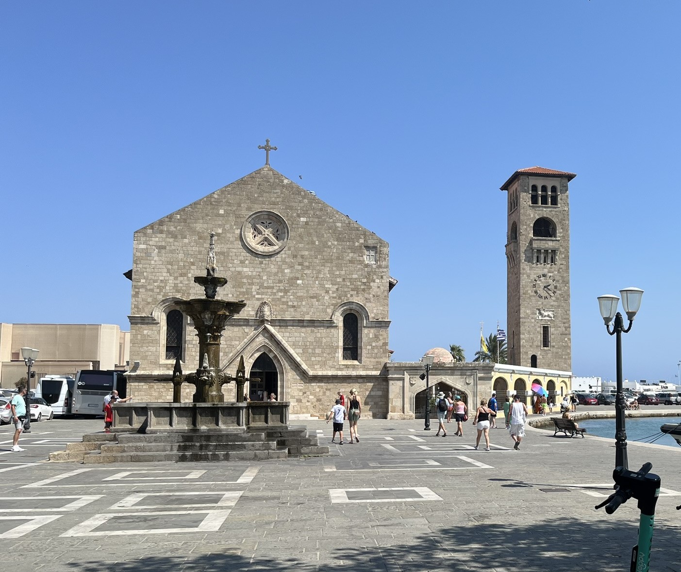 Ertesi gün Simi’ye gitmek üzere bavullarımızı alıp sahile iniyoruz. Meydandaki Fontana Grande Çeşmesi, İtalyanlar döneminde Viterbo’daki çeşmenin bir kopyası olarak yapılmış. Evangelismos Kilisesi’nin önünde yer alıyor. Kilise 1925 yılında inşa edilmiş.