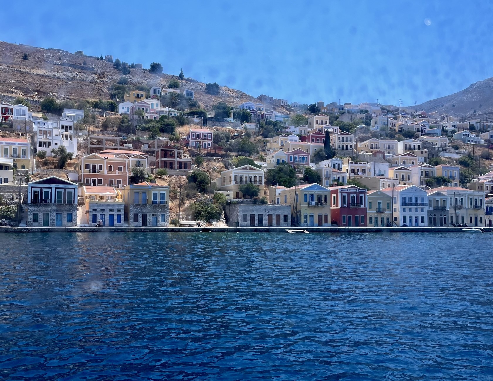 Kocaman ve kendine özgü tarzıyla dikkat çeken bir bina gözümüze çarpıyor: 1924 yılında yapılmış Erkek Okulu. Tam karşısında, küçük bir parkın içinde Yunanlı yazar, ekonomist ve politikacı İoannis Zighdis’in (1913–1997) büstü yer alıyor. İtalyan işgali döneminden kalma Balilla Evi’nin mimarisi hâlâ zarifliğini koruyor. Mavi-beyaz boyalı, bugün modern bir kafeye dönüşmüş İtalyan tarzı bir konağın önünden geçerek aşağıya iniyor, limana doğru ilerliyoruz.