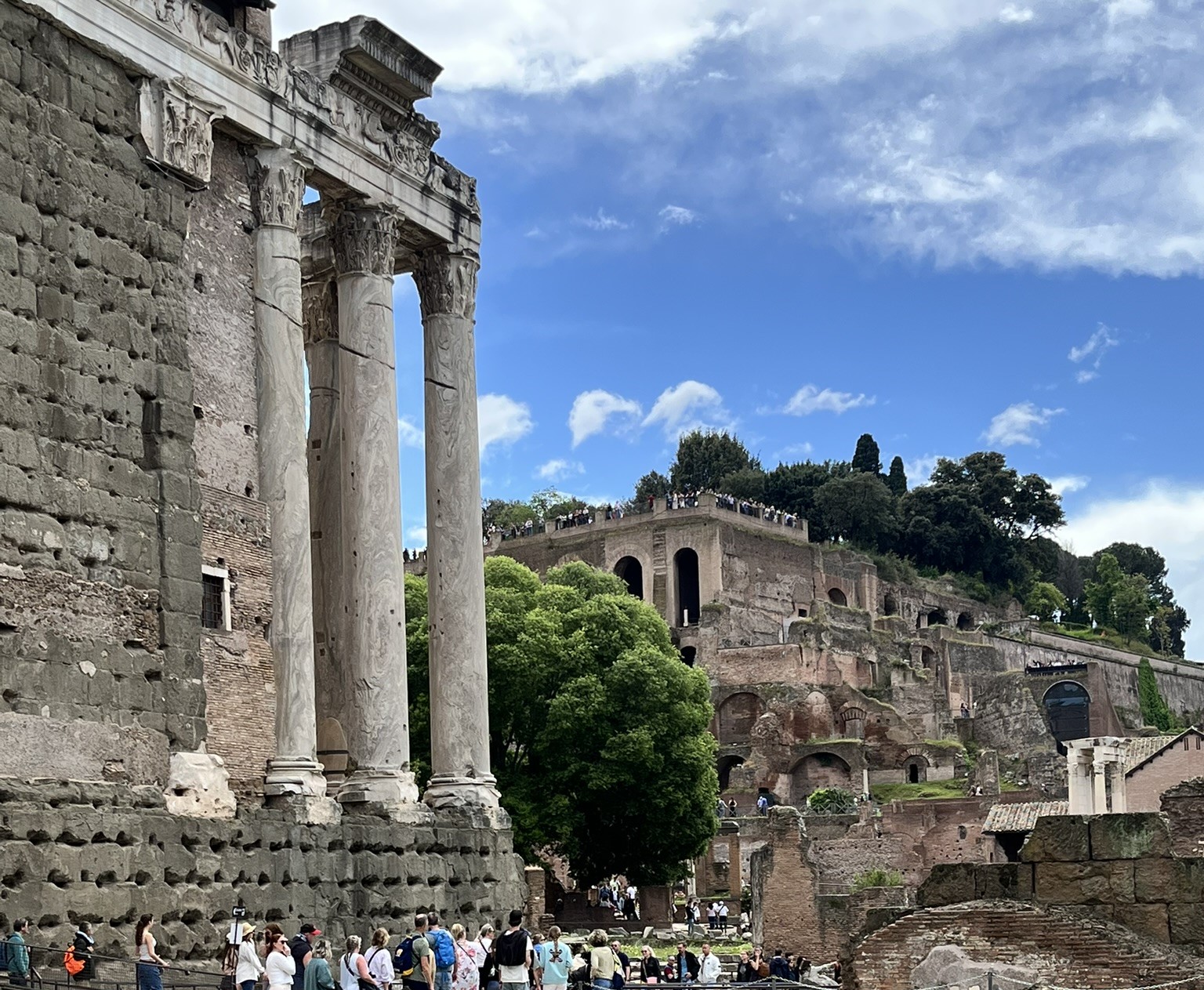 Roma Forumu’nun en eski tapınağı olan Satürn Tapınağı’nın sütunları özellikle muhteşem gözüküyor. Arkeolojik kalıntılar arasında neler yok ki: Regia (Kralın evi) Vesta Tapınağı (Tanrıça Vesta’nın kutsal bakire rahibelerinin yaşadığı tapınak) Rostra (Hatiplerin meydanlarda konuşma yaptığı kürsüler) Tabularium (Bronz levhalardan oluşan senet ve kontratların saklandığı yer) Septimius Severus Kemeri ve Titus Kemeri Antoninus ve Faustina Tapınağı