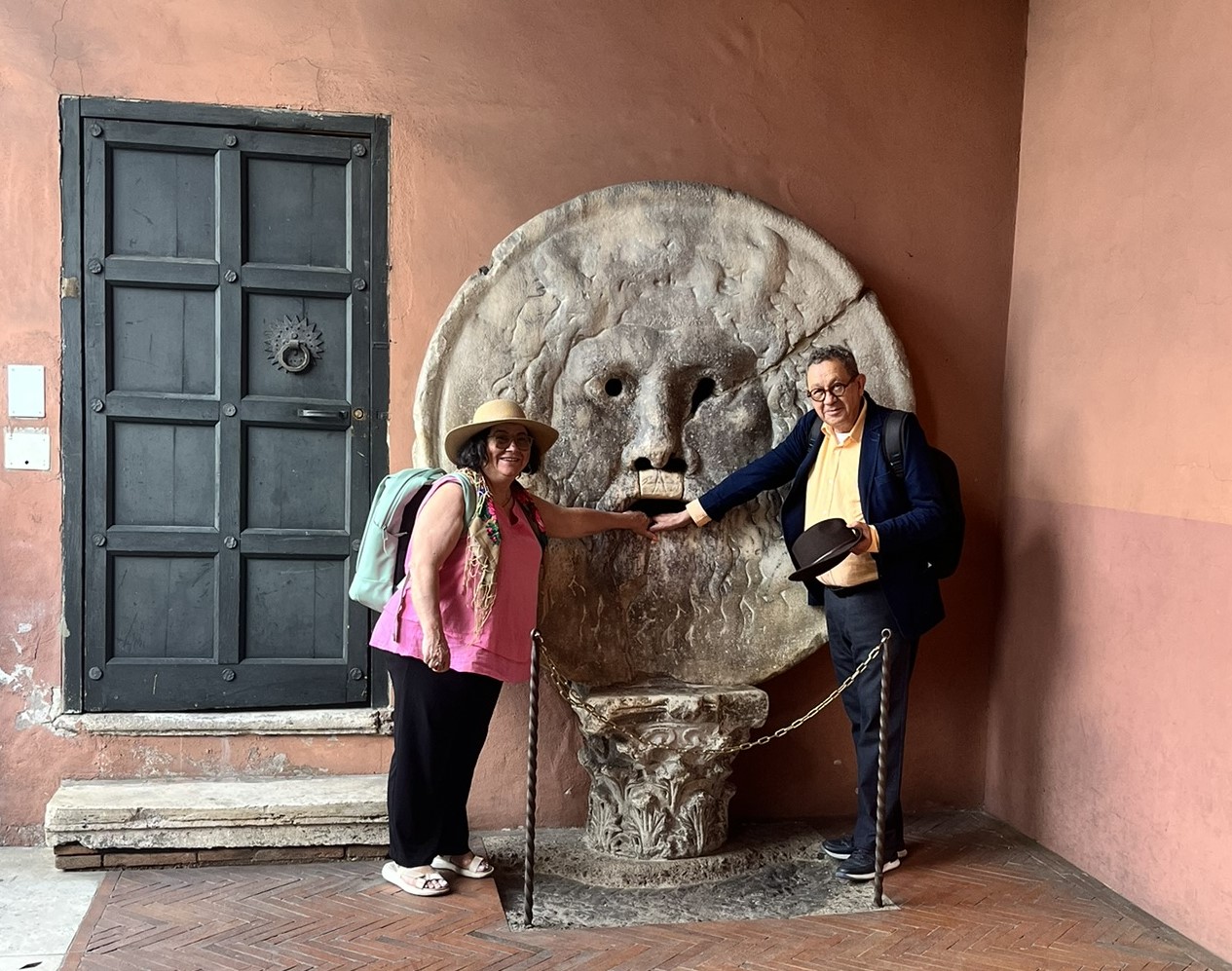 Aslında bu ünlü maske, Cloaca Maxima kanalizasyon kapağı’ya ait süslü bir antik kanalizasyon kapağıymış. Sakallı yüz figürünün bir nehir tanrısını, Jüpiter’i ya da bir faunu simgelediği düşünülüyor. “Gerçeğin Ağzı (Bocca della Verità)” adı ise Orta Çağ’dan kalma bir efsaneye dayanıyor: Yalan söyleyenlerin elini ısırdığına inanılıyormuş. Biz de sıraya girip kendi şansımızı deniyoruz; hem heyecan hem de gülümseme iç içe geçmiş durumda.