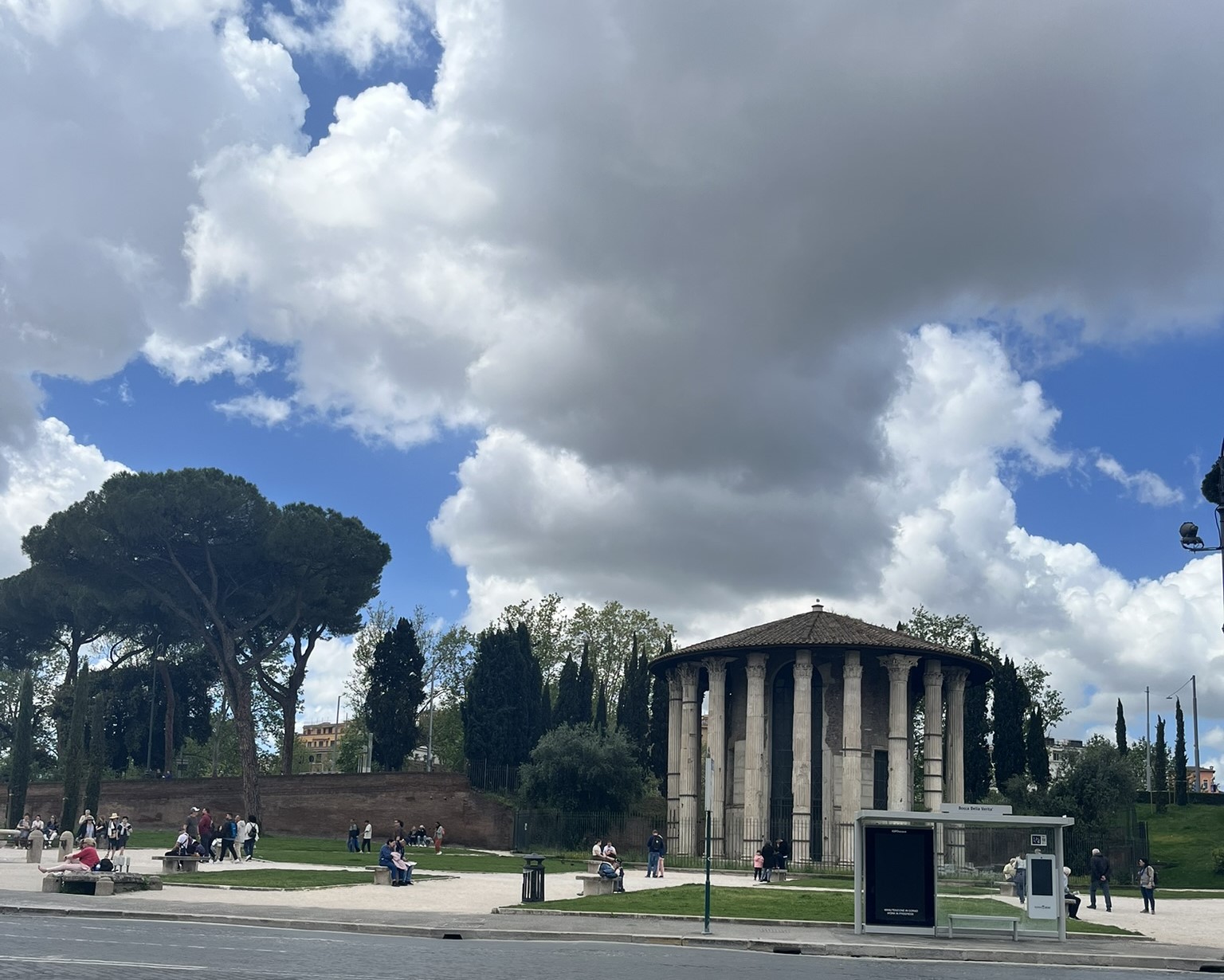 Meydanda, yuvarlak planlı küçük Herkül Tapınağı duruyor. Volkanik bir taban üzerine oturan Korint sütunlarıyla, Roma’da ayakta kalan en eski mermer tapınaklardan biri.
