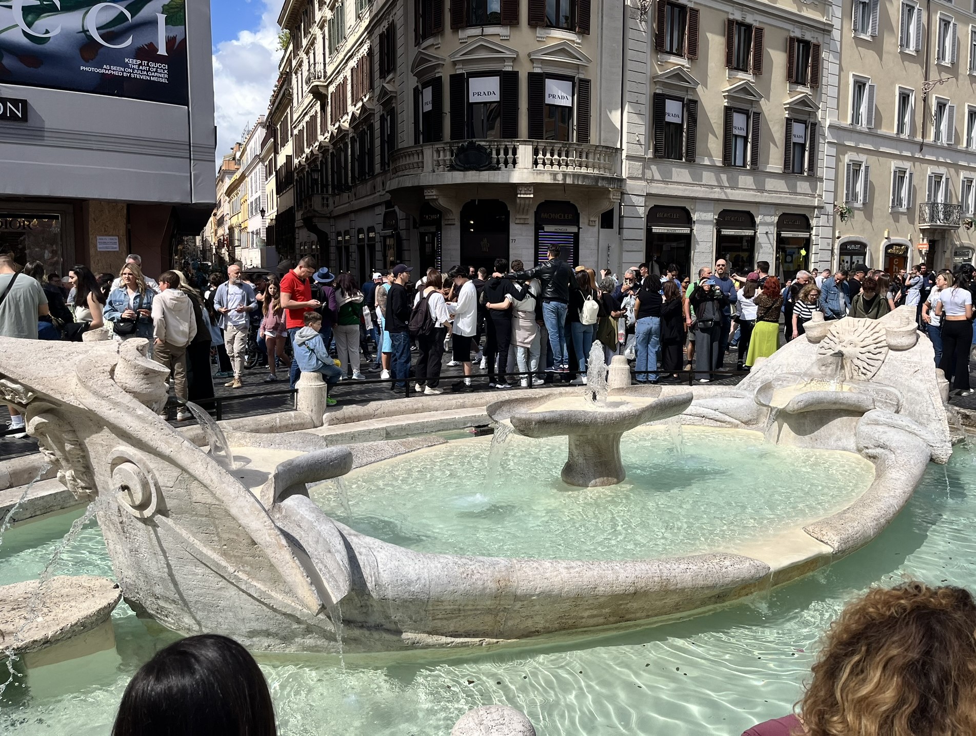 Boş bir alan bulup fotoğraf çekmek için epey uğraşıyoruz; kalabalığın enerjisi, merdivenlerin renkleri ve çevredeki hareketlilik birleşince Roma’nın canlı ritmini hissetmek mümkün oluyor. Merdivenlerin hemen altında, yarı batmış bir gemi biçimindeki Batık Tekne Çeşmesi yer alıyor. Bernini ailesinin imzasını taşıyan bu Barok eser, Roma’nın teatral estetiğini ve tarih boyunca süregelen sanatsal ihtişamını yansıtan yapılardan biri.
