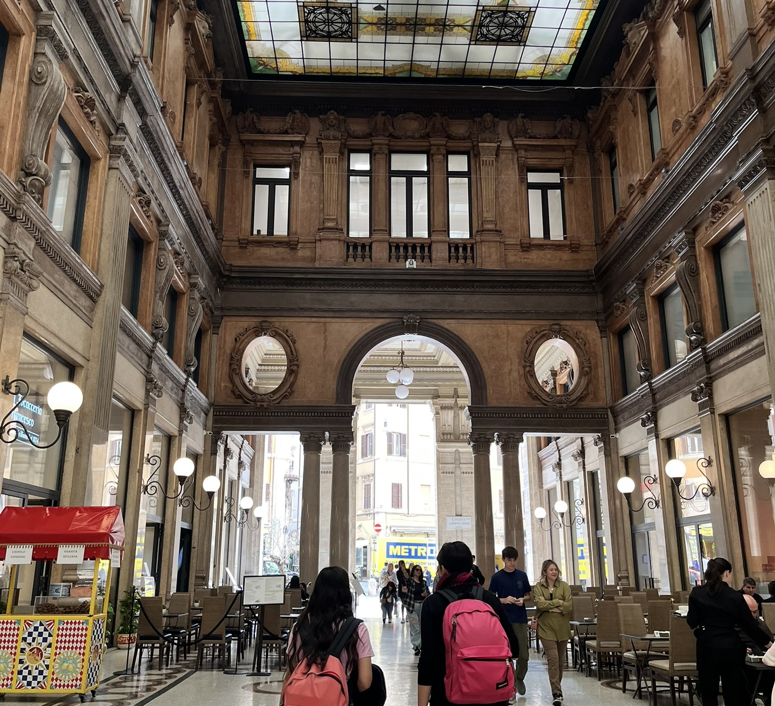 Bir kafeye oturup kahvemizi yudumlarken, çevremizi saran zarafet ve nostaljik güzellik arasında kayboluyoruz; Galleria Alberto Sordi, adeta hem göze hem de ruha hitap eden bir durak gibi.