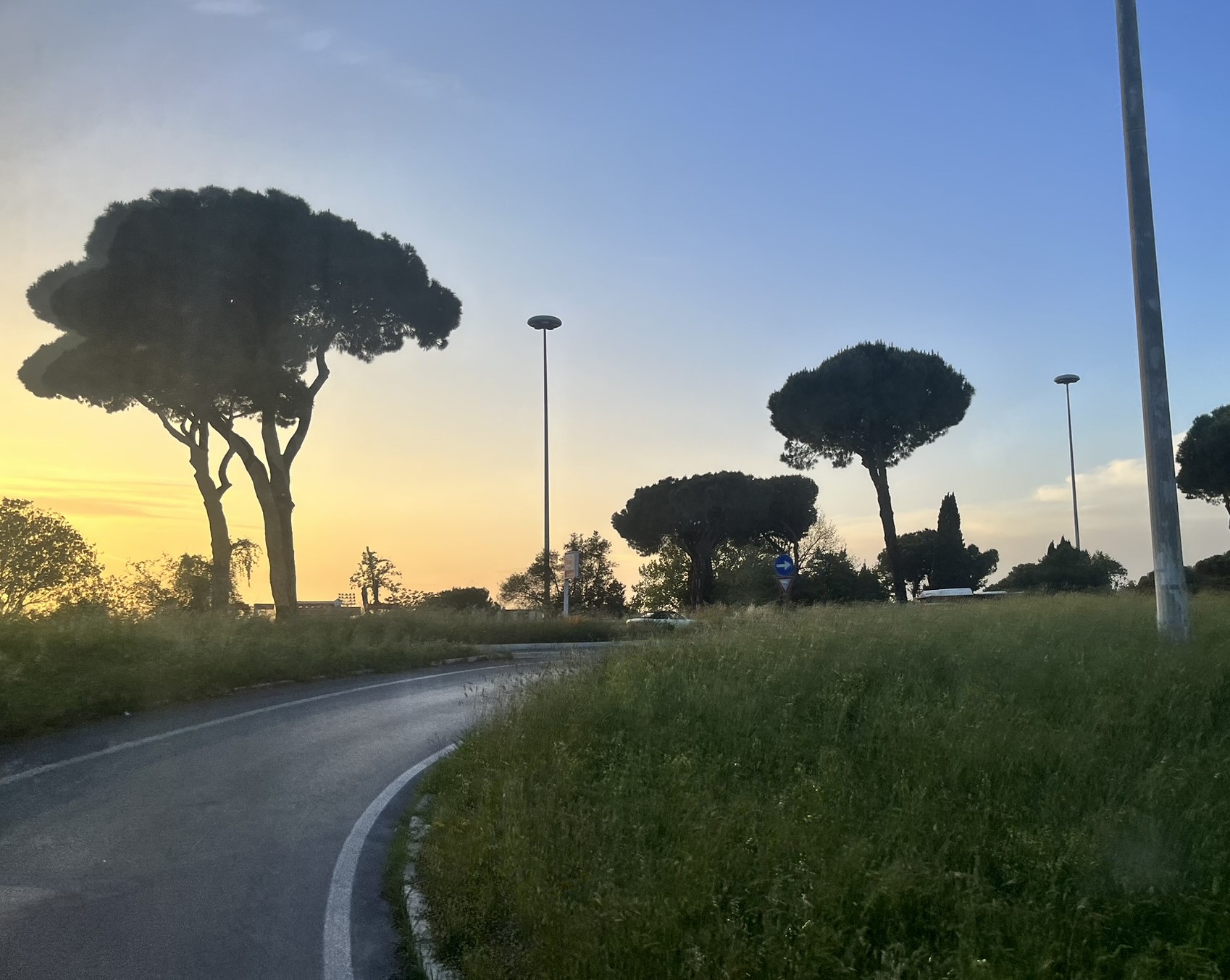 Havaalanından ancak saat 19.30’da çıkabildik. Akşamın yumuşayan ışıkları altında Roma’ya doğru ilerlerken, yolumuz bizi Apenin Dağları’ndan doğup şehri ikiye bölen Tiber Nehri kıyılarına götürüyor. Yol boyunca Roma’nın heybetli ağaçları bize eşlik ediyor.