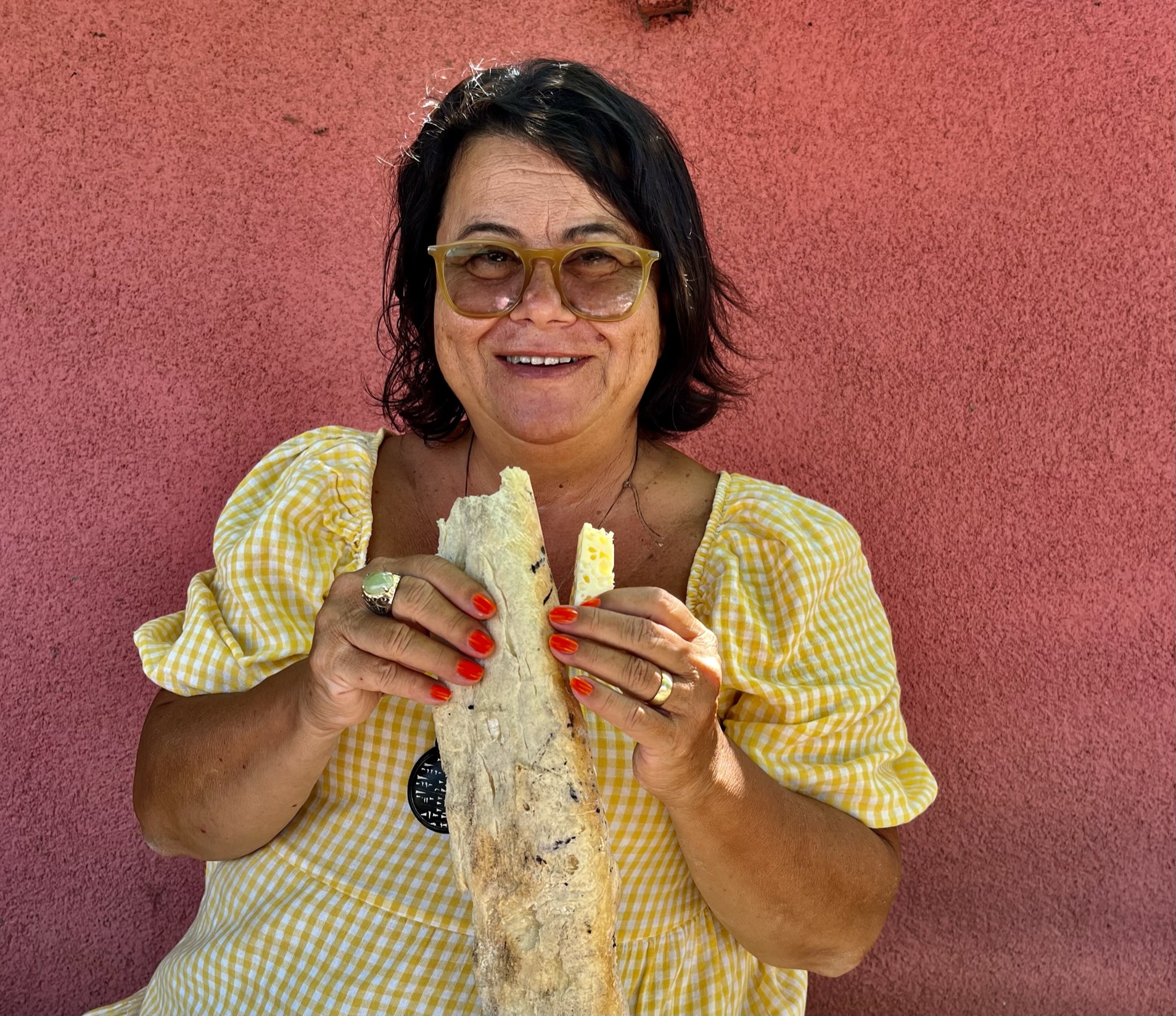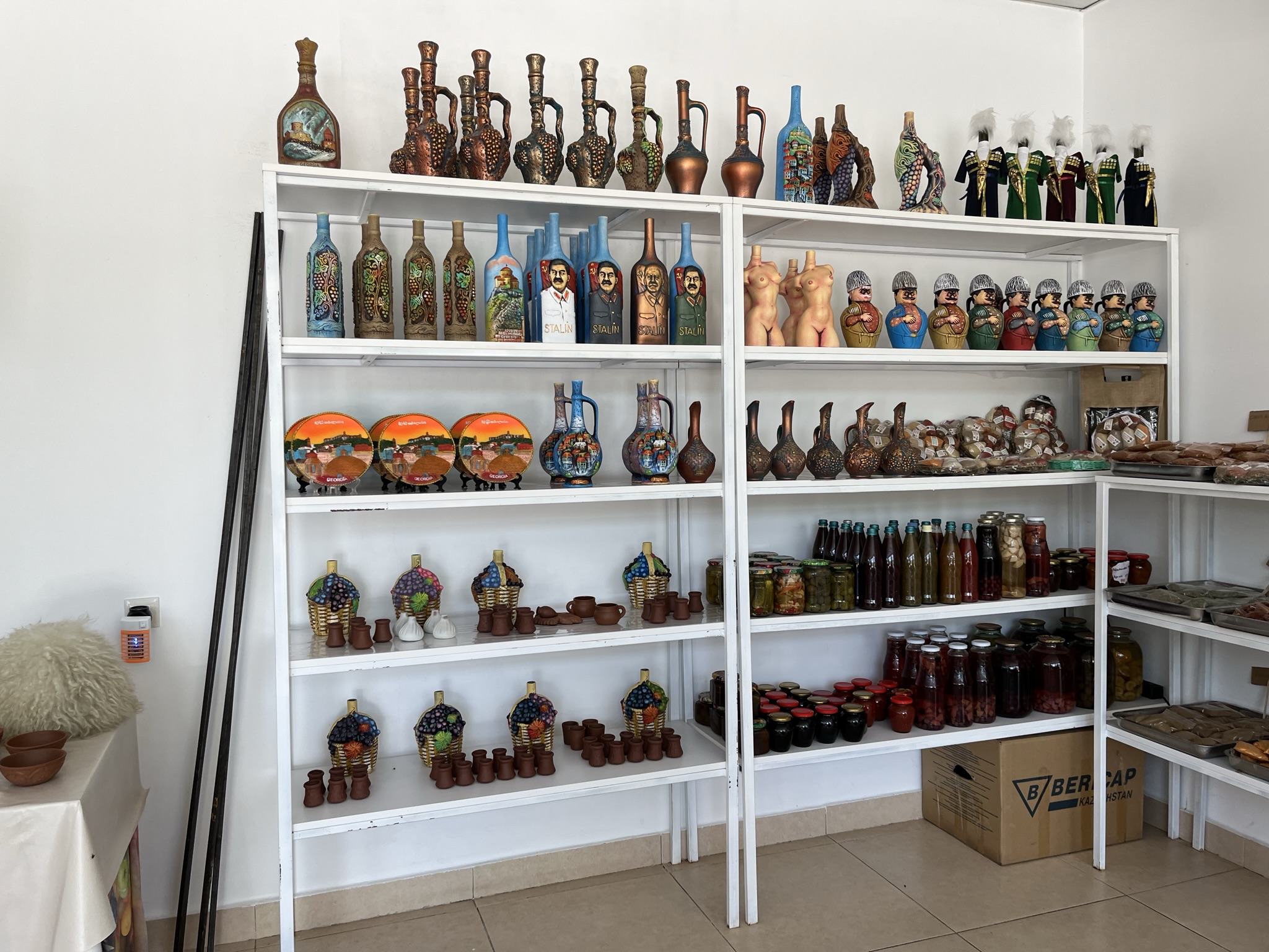 Gürcistan’ın birçok yerinde özellikle pazarlarında sıkça rastlanan, geleneksel mum şeklinde tatlı “curchela” çeşitlerin bulunduğu bir dükkâna giriyoruz. Bizim cevizli sucuk, “Pestil ve Köme” miz. Üzüm, fındık ve undan yapılan tatlı, içine badem, ceviz, çikolata konularak bir ipe geçirildikten sonra üzüm suyu ya da dut gibi başka meyvelerin suyuna batırılıp sosis şeklinde kurutulmasıyla yapılıyor. İplerden sarkan rengârenk tatlılar. Gürcistan’a ait küçük hediyelik eşyalar, bal, baharat, Gürcü Brendisi, şarap satılıyor.Saati iki yaptık karnımız acıktı. Ağaçların arasında kendi ürünlerini satan dağ köylülerinin kurduğu tahta masalarda öyle güzel karnımızı doyurduk ki tadı hala damağımda. İri yarı Gürcü bayan bir çeşit tulum peyniri olan Guda’dan kocaman bir parça kesip, doğal domates ve buram buram kokan Tonis Puri (Gürcülerin tandır ekmeği) eşliğinde veriyor. Nefis mi nefis. Peynirden satın almak istiyoruz ama bu uzun seyahatte koruyamayacağımızı düşünerek vaz geçmek zorunda kalıyoruz.