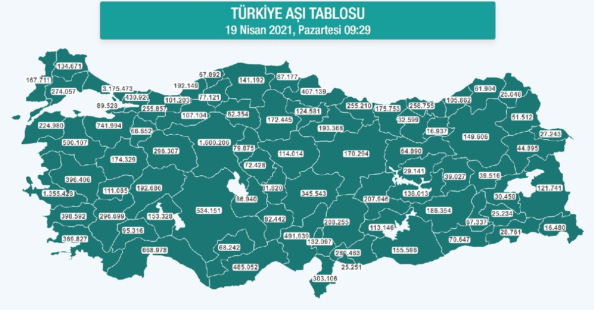 Sağlık Bakanlığı tarafından uygulanan birinci ve ikinci doz toplam aşı miktarı 20 milyonu aştı. covid19asi.saglik.gov.tr sitesinde yer alan bilgilere göre birinci doz aşı olan kişi sayısı 12 milyon 211 bin 179, ikinci doz aşı olan kişi sayısı 7 milyon 795 bin 206 bin oldu.