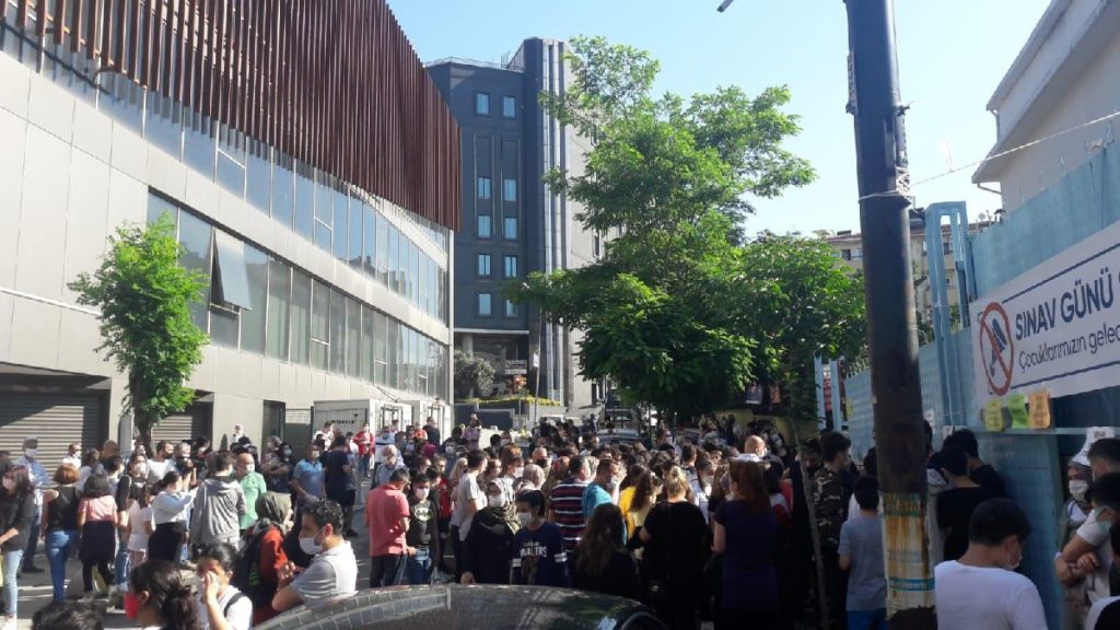 Türkiye’nin dört bir yanından gelen karelerde veli ve çocukların sadece sınavın gerçekleştirileceği okul önlerinde değil, duraklarda da sosyal mesafeyi hiçe sayarak yoğun kalabalıklar oluşturduğu görüldü.