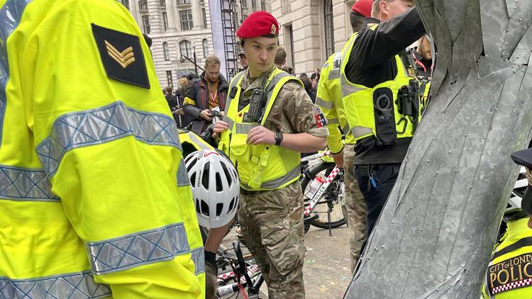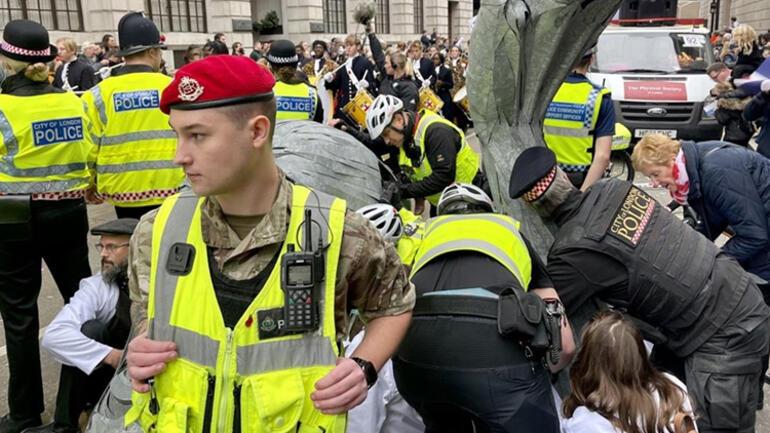 “Extinction Rebellion” çevreci grubu aktivistleri, geçit töreni sırasında bir anda caddeye kurdukları metal düzeneğe kendilerini zincirledi.