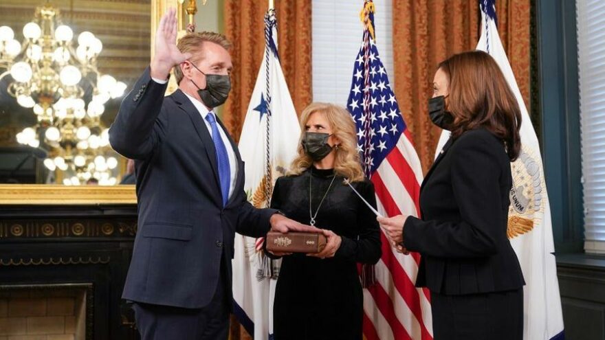 ABD’nin başkenti Washington’daki Eisenhower İdari Ofis Binası’nda düzenlenen törene katılan Jeff Flake’e Başkan Yardımcısı Kamala Harris ve eşi Cheryl Flake eşlik etti.