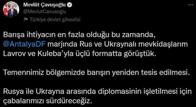 Sosyal medya hesabından açıklama yapan Bakan Çavuşoğlu, “Barışa ihtiyacın en fazla olduğu bu zamanda, Antalya Diplomasi Forumu marjında Rus ve Ukraynalı mevkidaşlarım Lavrov ve Kuleba’yla üçlü formatta görüştük. Temennimiz bölgemizde barışın yeniden tesis edilmesi. Rusya ile Ukrayna arasında diplomasinin işletilmesi için çabalarımızı sürdüreceğiz.” dedi.