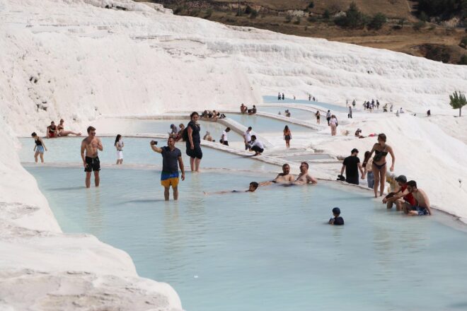 Travertenler üzerinde yürüyüş yapan turistler, antik havuza girip 36 derece sıcaklıktaki suda tarihi kalıntılar arasında yüzdü.