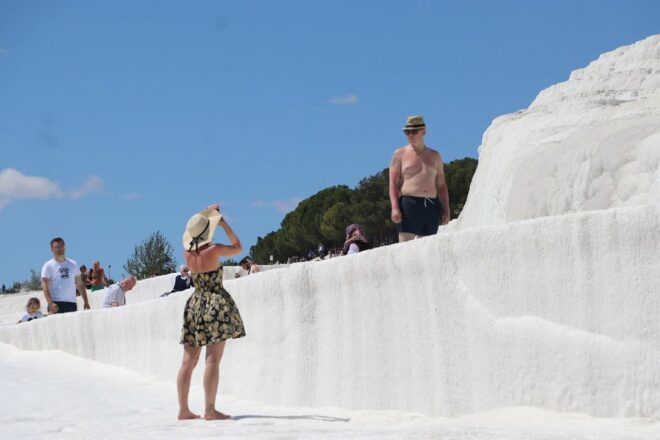 Ziyaretçilerden Yiğit Göğüs ise “Burası dünyaca ünlü bir yer. Gelmeyenler Pamukkale’yi kesinlikle ziyaret etmeli. Çıplak ayakla travertenlerin üzerinde yürümek çok güzel bir his. Bir zorluğu yok. Bu sayede travertenlerin korunması ve beyaz kalması da sağlanıyor” diye konuştu.