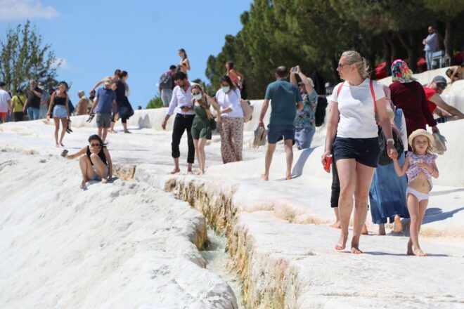 Yabancı turistlerin yanı sıra yerli ziyaretçiler de doğa harikası ‘beyaz cennet’e yoğun ilgi gösterdi. Turistler, doğal güzelliği ve tarihi dokusuyla ön plana çıkan Pamukkale’yi gezdi.
